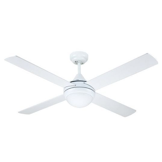 Ceiling Fan, 1220 mm, 4 Blade, 240 Volt, 52.4/36.3/20.9 Watt Motor, 182/145/102 rpm Motor Speed, AC Motor, 3 Speed Wall Control, 10843/8637/6459 cu-m/hr, 12 deg Blade Pitch, 32 deg Ceiling Rake, Ceiling Mounting, Pressed Steel Body, NZ Plywood Timber Blade, Pressed Steel Canopy, White Body, White Blade, 420 mm Height