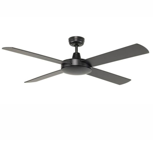 Ceiling Fan, 52 in, 4 Blade, 240 Volt, 12/21/54 Watt Motor, 188/116/73 rpm Motor Speed, AC Motor, 3 Speed Wall Control, 10450/6500/4250 cu-m/hr, 11 deg Blade Pitch, 32 deg Ceiling Rake, Ceiling Mounting, Die-Cast Aluminium Body, Painted Plywood Blade, Die-Cast Aluminium Canopy, Black Body, Black Blade, 280 mm Height