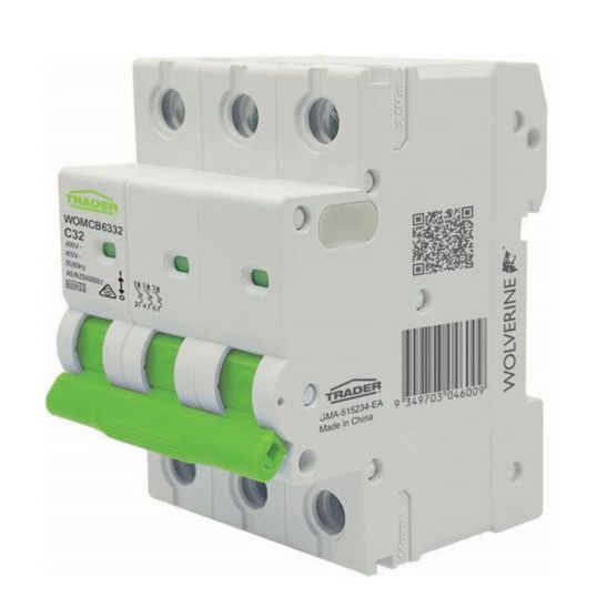 Miniature Circuit Breaker C Curve, 400/415 Volt, 32 Amp, 6 kA Interrupt Capacity, 3 Module, 3 Pole, 2.5 Nm Tightening Torque, IP20, DIN Rail Mounting, 82 mm Height, 62 mm Width, 17.8 mm Depth