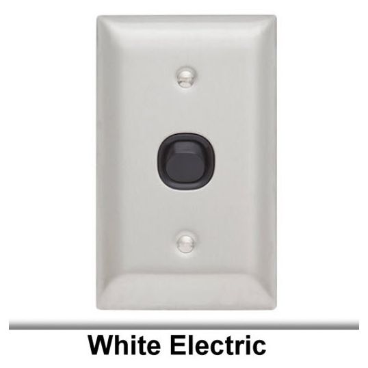 Switch Standard, 250 Volt AC, 10 Amp, 1 Gang, Horizontal/Vertical, Mounting Centres: 84 mm, Flush Mount, Actuator Type: Rocker, 1/2 Way, Screw Connection, Stainless Steel, White Electric, 115 mm Height, 70 mm Width, 30 mm Depth
