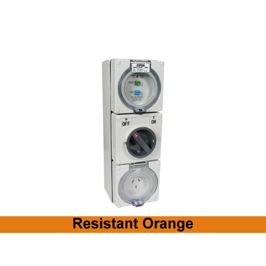 Switch Socket Outlet Surface Mounting RCD Protected, 1 Phase, 10 Amp, 250 Volt AC, 3 Pole, 3 Gang, 3 Pin Flat, Trip Sensitivity: 30 mA, Screw, Terminal Capacity: 2.5 to 6 mm Cable, Surface Mount, IP66, PC + PET, Chemical Resistant Orange, 294 mm Height, 101 mm Width, 100 mm Depth, -25 to 75 deg C