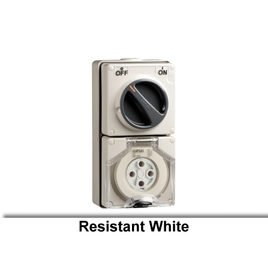Switch Socket Outlet Surface Mounting Weatherproof, 3 Phase, 32 Amp, 500 Volt AC, 50 Hz, 4 Pole, 4 Pin Round, 3P + E, Screw, 2 x M20, 1 x M25, Terminal Capacity: 6 to 16 mm, Surface Mount, IP66, PC And PET Cover, Phosphor Bronze Pin, Chemical Resistant White, 204 mm Height, 101 mm Width, 108 mm Depth, -25 to 75 deg C