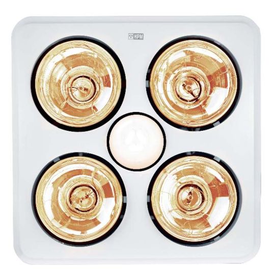 3-In-1 Bathroom Heater, 230-240 Volt AC, 30 Watt Motor, 135 cu-m/hr (with Ducting), 189 cu-m/hr (No Ducting), 38 l/sec (with Ducting), 53 l/sec (No Ducting), 1 X 7 Watt LED (Supplied), Max. Rating 100 Watt Halogen Lamp, 300mm x 300mm Cut-Out, 100mm Diameter Duct