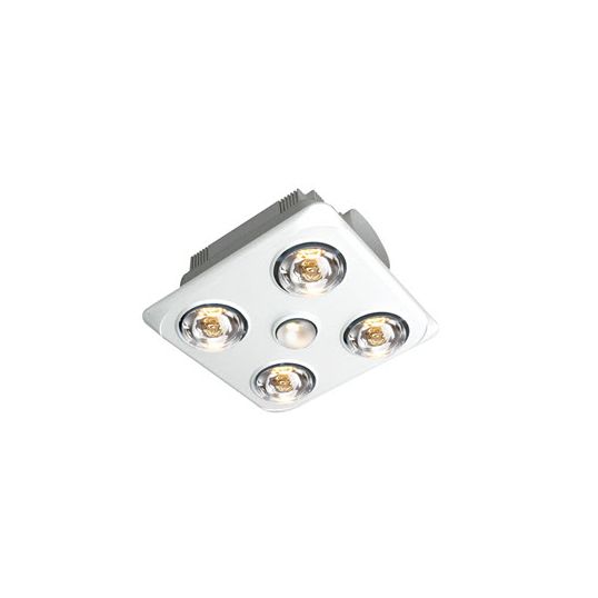 Bathroom Exhaust Fan/Light/Heater, 150 mm, 220-240 Volt, 4 x 275 Watt Infrared Lamp Heat Source, 1 x 60 Watt R80 ES Reflector, Square, 360 cu-m/hr, 40 Watt Lamp, 4000K, 600 lm Lamp Lumens, 375 mm x 375 mm Cut-Out, 150 mm Duct, IPX4, White Body