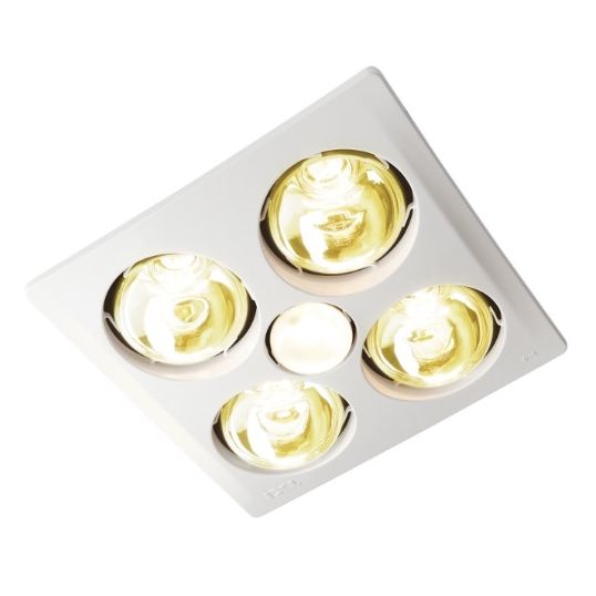 Bathroom Exhaust Fan/Light/Heater, 170 mm, 240 Volt, 275 Watt Heat Source, 12 Watt R80 LED, Square, 223 cu-m/hr, 62 l/sec, 275 Watt Lamp, 330 mm Width x 330 mm Depth Cut-Out, 150 mm Duct, 2.7 mtr Max Ceiling Height, White Body, 381 mm Width, 381 mm Depth