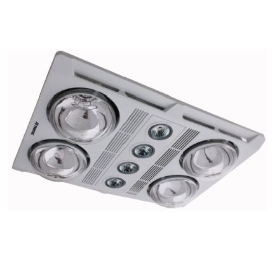 Combination Exhaust Fan Light and Heater, 240 Volt, Heat Source: 4 x 275 Watt Infrared Lamp, Light Source: 4 x 6 Watt GU10 LED, Air Flow Rate (cu-m/hr): 460 cu-m/hr, Cut-Out Size: 435 x 275mm, Max. Ceiling Height: 210mm, White, 360mm Length, 480mm Width, 200mm Depth