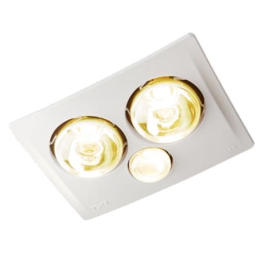 Bathroom Exhaust Fan/Light/Heater, 200 mm, 2 x 375 Watt Infrared Lamp Heat Source, 1 x 14 Watt Compact Fluorescent, Square, 279 cu-m/hr, 78 l/sec, 375 Watt Lamp, 2.7 mtr Max Ceiling Height, White Body