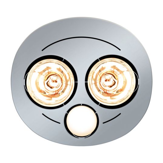 Bathroom Exhaust Fan/Light/Heater, 200 mm, 230-240 Volt, 2 x 275 Watt Infrared Lamp Heat Source, 1 x 14 Watt Compact Fluorescent, 240 cu-m/hr, 300 mm Cut-Out, 500 mm Max Ceiling Height, White Body, 374 mm Width, 240 mm Depth