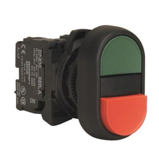 Double Pushbutton Actuator Flush Head, 10 Amp, 1 Normally Opened/1 Normally Closed Configuration, Non-Illuminated Momentary Action Operator Action, BLANK Operator Profile, Flush/Extended Head, Screw Terminal, 0.7 Nm Tightening Torque, Panel Mounting, 22.5 mm Mounting Diameter, IP65/66/69, Thermoplastic Housing, Green/Red, -25 to 70 deg C, 22.5 mm, 49.6 mm Diameter, 16.8 mm Depth, Multi-Function