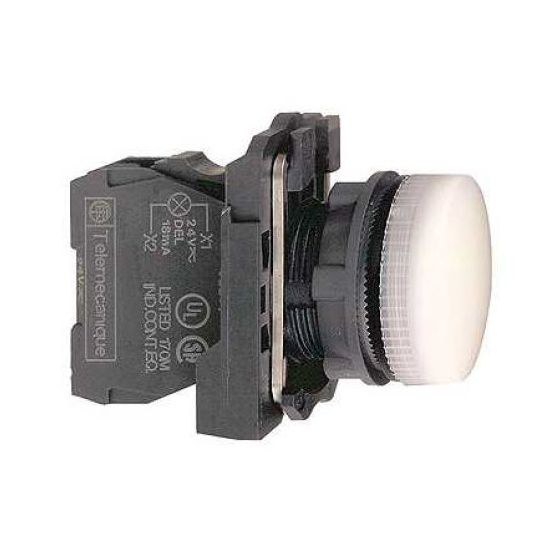 Pilot Indicator Light Complete, 230-240 Volt AC, Plain Lens Type, LED, Round, 100000 hr, White Lamp Colour, Standard Head, Screw Clamp/Plug-in/Printed Circuit Board/Faston Terminal, Panel Mounting, IP66/67/69/69K, NEMA 13/4X, Dark Grey Plastic Bezel, -40 to 70 deg C, 42 mm Height, 30 mm Width, 54 mm Depth, Integral LED