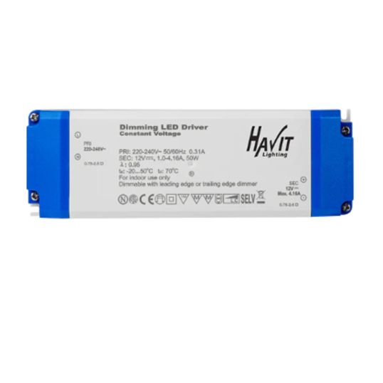 LED Driver, 100-240 Volt AC Input Voltage, 12 Volt DC Output Voltage, 50 Watt, 4.16 Amp, 47-63 Hz, Dimmable, IP20, >=0.95 at 230 Volt AC Power Factor, Plastic, White and Blue,-40 to 60 deg C, 184mm Length, 61mm Width, 32mm Height