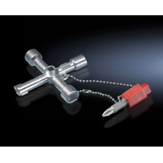 Universal key with 5 mm double-bit attachment, 7 mm and 8 mm triangular and square attachment plus bit adaptor and reversible bit for multi-tooth size 25 and 30.