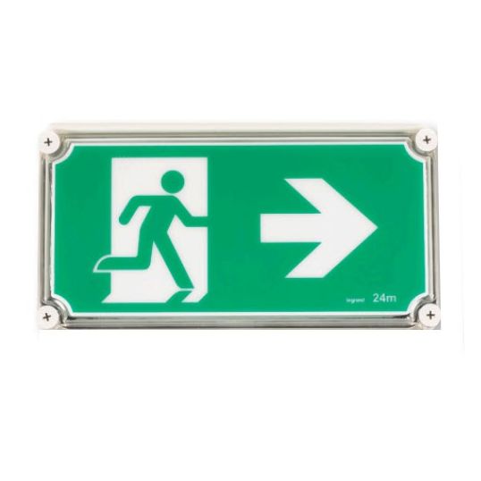 LED Emergency Exit Sign Weatherproof Single Sided, 5.4 Watt, 240 Volt AC, 50 Hz, LED, Maintained, Polycarbonate Diffuser, Viewing Distance: 24mtr, 10 to 40 deg C, 6.4 Volt 1.5 Ah Lithium-Ion, Polycarbonate, IP65, 131 mm Length, 381 mm Width, 191 mm Height
