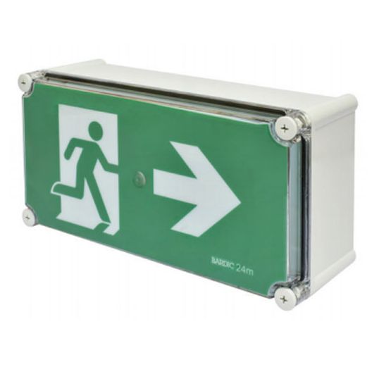 Emergency LED Exit Light, 3 Watt, 230 Volt Input Voltage, 50 Hz Input Frequency, LED, Maintained/Non-Maintained Switched Operating Mode, Wall/Surface Mounting, IP66, LiFePO4, 2 hrs Charging Time, Glass Filled Polycarbonate, 0 to 40 deg C, 385 mm Length, 135 mm Width, 185 mm Height