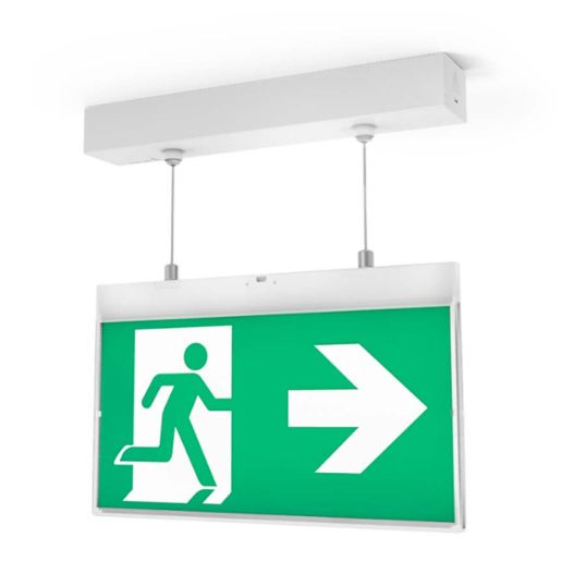 Surface Pendant Emergency Exit, 2.3 Watt (Standby), 2.6 Watt (Max), 230 Volt AC Input Voltage, 50 Hz Input Frequency, 24 mtr Viewing Distance, Maintained Operating Mode, PMMA Diffuser, Suspension-Single & Double Sided Mounting, IP20, LiFePO4, Polycarbonate, White, 0 to 40 deg C, 315mm Length, 12mm Width, 190mm Height