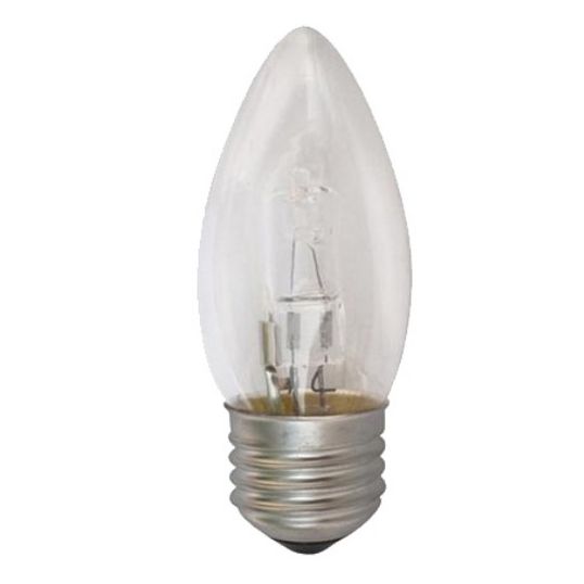 Halogen Lamp Energy Saver, 18 Watt, 220-240 Volt AC, 50/60 Hz, Plain Candle, E27 (ES) Base, Clear, Warm White, 2800K, 210 Lumens, 2000 hr Average Lamp Life, Dimmable, 35 mm Diameter, 95 mm Length, Power Factor: 1, -30 to 100 deg C