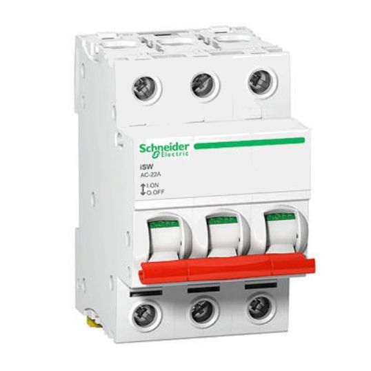 Switch Disconnector, 415 Volt, 100 Amp, 50/60 Hz, 3 Pole, Toggle, Tunnel Connection, DIN Rail Mounting, IP20, 1 x 50 sq-mm Terminal Capacity, White, -25 to 60 deg C, 85 mm Height, 54 mm Width, 73 mm Depth