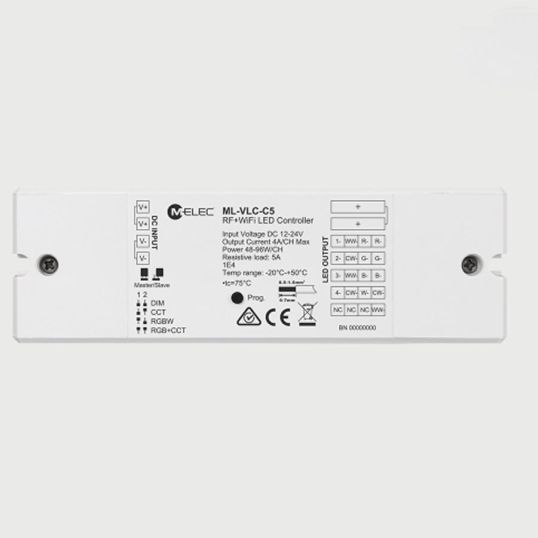 The C5 controller offers remote (RF) or Wi-Fi (Tuya App) control and is able to handle RGB, RGB+W, RGB+W+WW, CCT, or single channel dimming.