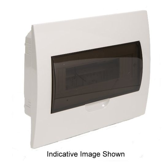 Load Centre Enclosure, 240-415 Volt, 100 Amp, 1 Row, 12 Module, IP40, Flush Mounting, For Use With MOD6 MCBs/RCDs and RCBOs Miniature Circuit Breakers, ABS, White, 246 mm Height x 304 mm Width x 95 mm Depth, Transparent Door