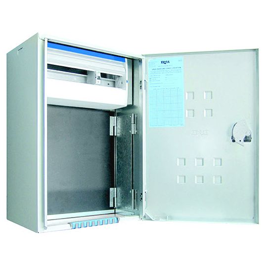 Meter Box Northern Territory, 63 Amp MCB, 18 Pole, Side Hinged Door, Padlock, 600 mm Enclosure Height, D10 Enclosure Width, 300 mm Enclosure Depth, 390 mm Panel Height, 385 mm Panel Width, IP23, DIN Rail Mounting, Steel, RAL 7035 Grey, Galvanised
