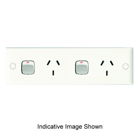 GPO Switched Outlet Flush Mount Skirting, 15 Amp, 240 Volt AC, 50/60 Hz, 2 Gang, Horizontal, Mounting Centres: 79 mm, Flush Mount, White, 46 mm Height, 98 mm Width