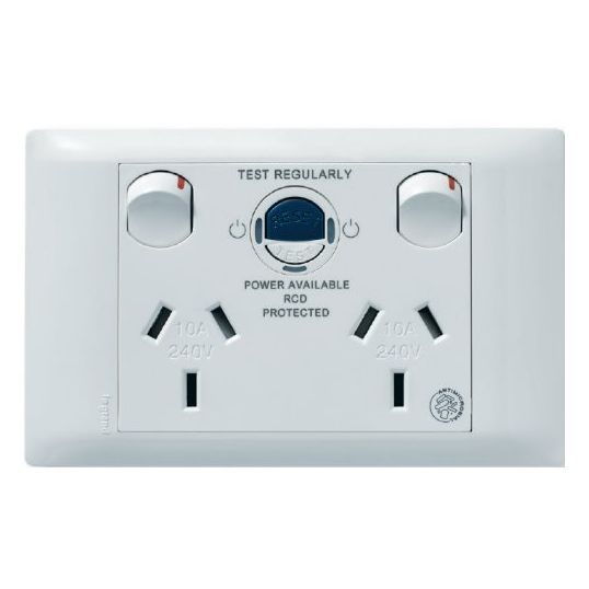 Medical GPO Switched Outlet Flush Mount RCD Protected, 230-240 Volt AC, 10 Amp, 50/60 Hz, 2 Gang, Trip Sensitivity: 10 mA, IP30, Flush Mount, Mounting Centres: 84 mm, Connection Type: Screw, Horizontal, Red, 118 mm Height, 74 mm Width, 10 mm Depth, 5 to 35 deg C