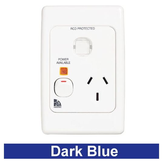 Switched Socket Outlet, 250 Volt Switch, 10 Amp, 50 Hz, 3, 1 Gang, Vertical Orientation, On/Off Button Control, Rocker Switch Actuator, Screw Connection, Plastic, Dark Blue, 116 mm Height, 76 mm Width, Power Neon RCD Label Circuit Identification