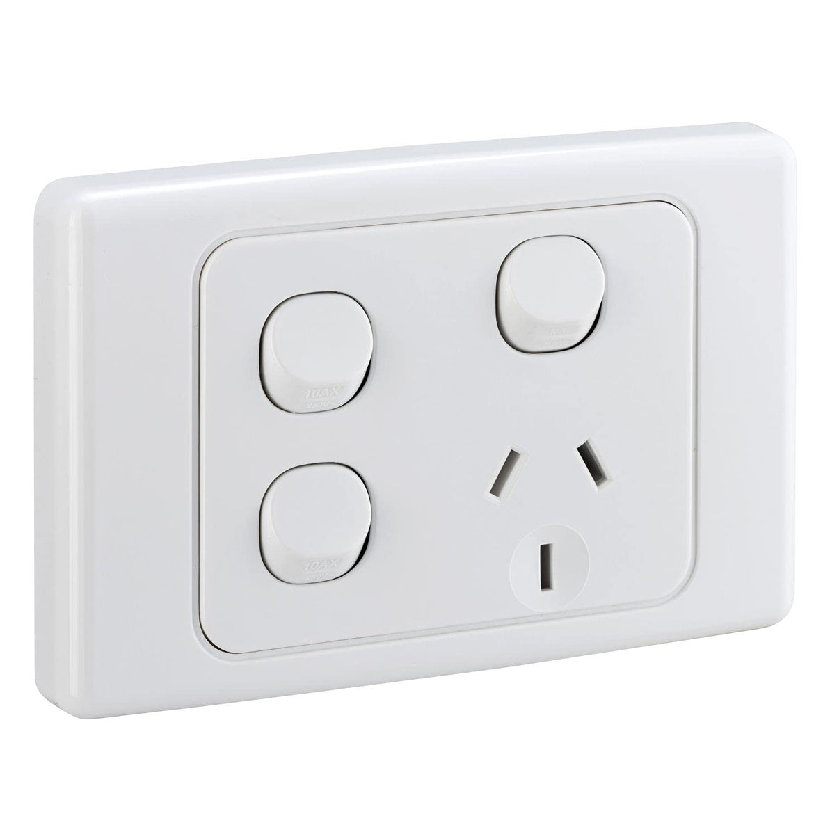 GPO Switched Outlet, 250 Volt Switch, 10 Amp, 50 Hz, 3, 1 Pole, 1 Gang, Horizontal Orientation, Flush Mounting, 84 mm Mounting Centres, Screw Connection, On/Off Button Control, Rocker Switch Actuator, Plastic, White, Glossy, 120 mm Height, 76 mm Width, 12 mm Depth