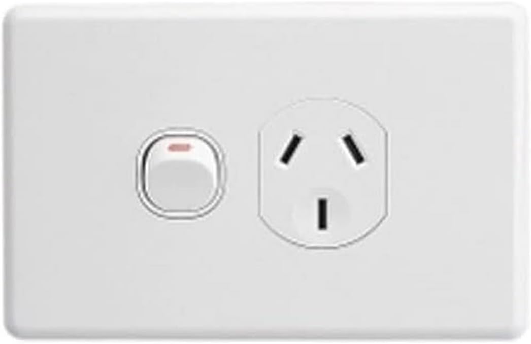GPO Switched Outlet, 250 Volt Switch, 10 Amp, 50 Hz, 3, 1 Pole, 1 Gang, Horizontal Orientation, Flush Mounting, 84 mm Mounting Centres, Screw Connection, On/Off Button Control, Rocker Switch Actuator, Plastic, White, Glossy, 116 mm Height, 76 mm Width, 28 mm Depth
