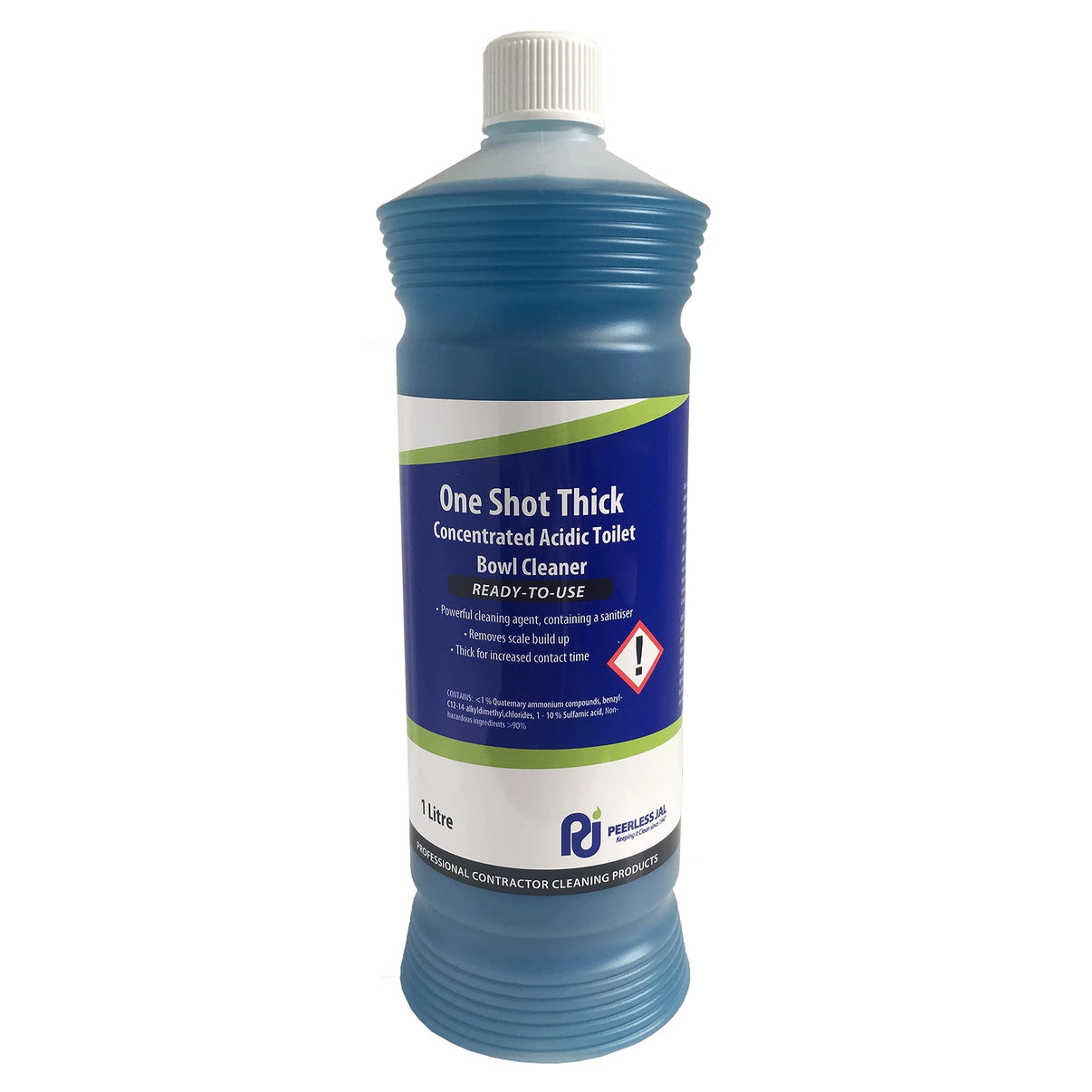 One Shot Thick will effectively remove uric acid build-up from urinals, stains and encrustations from porcelain, enamel and stainless steel surfaces. It has the full corrosive action of an acid, is non-fuming and leaves a most pleasant fragrance. One Shot Thick will cling to vertical surfaces giving longer contact time and better results.