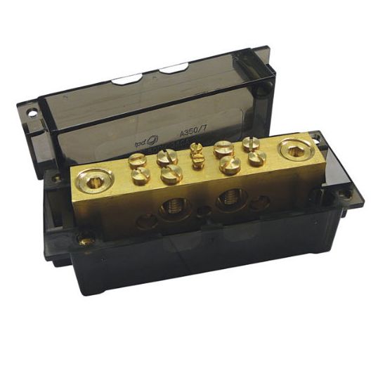 Neutral Link, 500 Volt, 350 Amp, 7 Hole, Front Wiring Connection, For Use With 16-120 sq-mm Cable, Panel Mounting, Black, 120 mm Length x 46 mm Width x 52 mm Depth