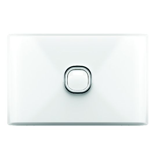 Switch, 250 Volt Switch, 20 Amp/16 AX, 1 Gang, 2 Way, Screw Connection, Brass Tunnel Terminal, 4 x 1.5 sq-mm Terminal Capacity, Horizontal Orientation, Wall Mounting, 84 mm Mounting Centres, UV Stabilised Polycarbonate, White, 74.1 mm Height, 114.8 mm Width, 25.4 mm Depth