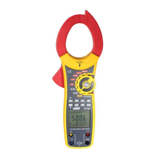 Clamp Meter True-RMS Power, AC: 100-750 Volt, AC: 40-1000 Amp, 50-200 Hz, 9 Volt Battery, -50 to 1300 deg C, Large Dual LCD Display with 9999 Count and Bargraph Display, 55mm Jaw,injection Moulded Enclosure, 335mm x 70mm x 21mm, IEC 61010-1 CAT IV 600V
