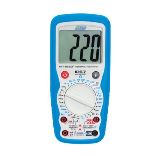 Digital Multimeter General Purpose Manual Range, DC: 200 mV - 1000 Volt, AC: 2-700 Volt, DC: 10 Amp, AC: 10 Amp, 2000 kHz, 200 Ohm - 20 MOhm Resistance, 2 nF - 200 uF, 9 Volt Battery, -20 to 760 deg C, 2000 Count LCD Display, Double Moulded Waterproof IP67 Enclosure, 182mm x 81mm x 50mm, IEC 61010-1 CAT IV 600V