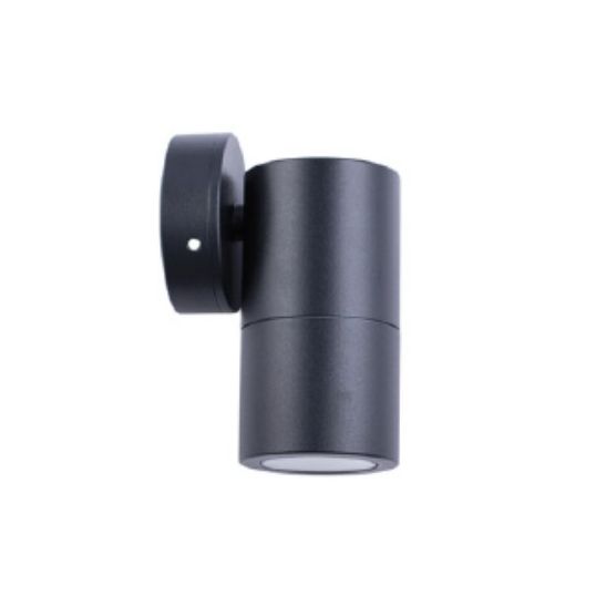 Wall Pillar Single Fixed Downward, Halogen, 35 Watt Max,110-265 Volt AC, 50/60 Hz, Halogen, 1XGU10 Lamp Base, Wall Mount, IP65, Aluminium, Powder Coated Black, 110 mm Length, 60 mm Width, 125 mm Height, 85 mm Projection, Exterior