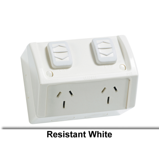 GPO Switched Outlet Weatherproof, Large, 1 Phase, 15 Amp, 250 Volt, 50 Hz, 2 Gang, 3 Pin, Sliding ON/OFF Button, Resistant White Electric, IP53, Surface Mount, Horizontal, Mounting Centres: 84 mm, Plastic, Screw Connection, Terminal Capacity: 3 x 2.5 mm, Conduit Entry: 2 x 20 mm Flash Out, 115 mm Height, 85 mm Width