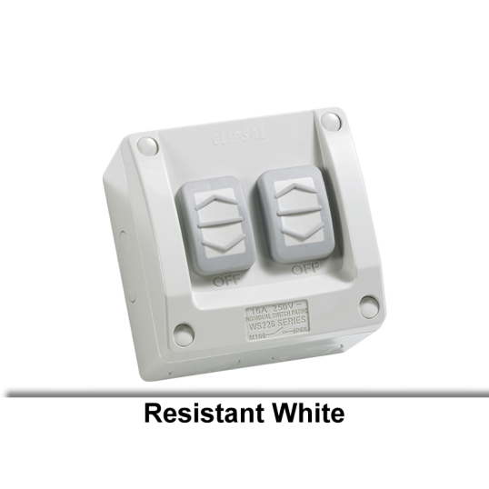 Clipsal Switch Sliding Surface Mount Weatherproof Square 2 Gang 16A 250V IP66 Horizontal Chemical Resistant White