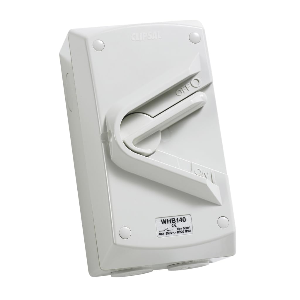 Clipsal Weathershield 1 Gang 1 Pole 250VAC 40A Hoseproof Surface Mounting Switch is specifically designed to suit the harsh Australian environment. The complete range includes a huge 8mm diameter padlocking facility and a rotary handle, which ensures the product will not accidentally be switched on. Raised on/off marking is also defiantly not to rub off. This weatherprotected isolating switch is suitable for virtually any external application. The impact resistant base and cover will survive the hardest knocks in almost any installation. The two sections are sealed with a co-injection gasket. The range provides ample conduit entries and is suitable for side entry from a vertical duct. It is compact size means it is aesthetically pleasing and suits installations where space is limited such as with residential air conditioning, outdoor lighting and small motor control. Comes in resistant grey colour.
