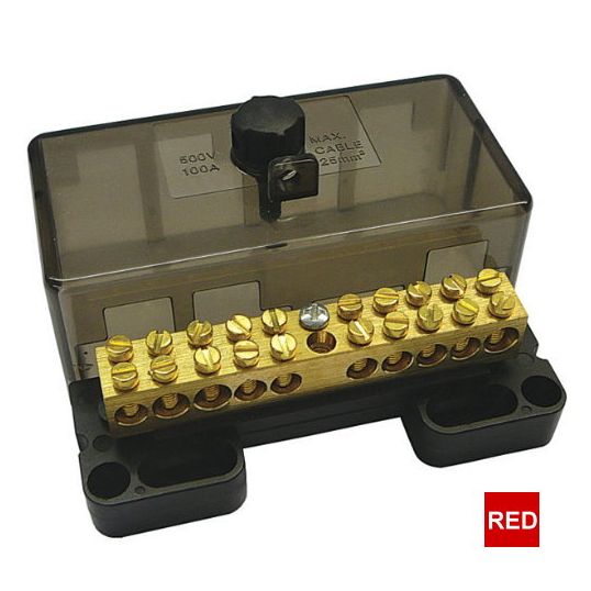 Active Link, 500 Volt, 100 Amp, 10 Hole, Front Wiring Connection, For Use With 16-25 sq-mm Cable, Panel Mounting, Red, 100 mm Length x 50 mm Width x 49 mm Depth