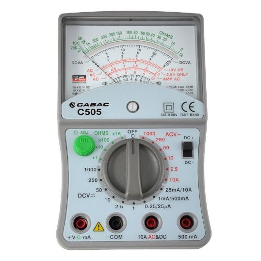 Analogue MultiMeter Professional, 10 Amp AC, 25 uA/1/25/250 mA/10 Amp DC, 0.2 to 20 kOhm/2 to 200 kOhm/20 to 2 MOhm/200 to 20 MOhm, Analog Display, +/-3% AC, +/-2% DC Accuracy, 1600mm Length x 100mm Width x 45mm Thickness