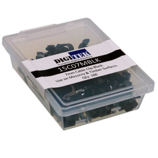 The Digitek 15C07MBLK is a 7mm black cable clip supplied in a box of 100. Used to mount RG6 Quad Shield cable to either masonry or timber surfaces. Also available in white (05C07MWH)