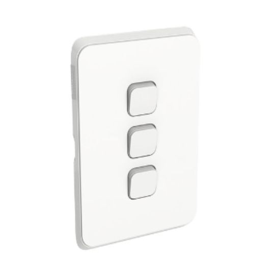 Switch Cover Skin, 3 Gang, For Use With Domestic Switching Devices, Horizontal/Vertical Orientation, Clip-On Terminal, Flush Mounting, Polycarbonate/ABS/Plastic, Vivid White, Matte, 0 to 45 deg C, 120 mm Height, 78 mm Width, 9 mm Depth