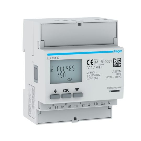 Hager Kilowatt Hour Meter Electronic DIN Rail Mount via CT 1-5A 4M S0 MID 50Hz