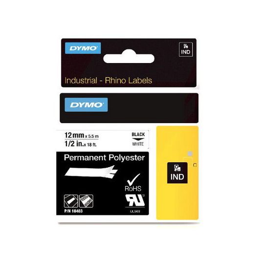Label Printer Refill Cartridge Heatshrink Tube, Thermal Transfer, 12 mm x 5.5 mtr Label, Black on White Legend, Rhino and Label Manager Printers, For Use With Panels/Blocks/Faceplates/Shelves/Bins/Beams and More, -40 to 150 deg C