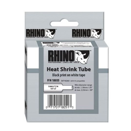 Label Printer Refill Cartridge Heatshrink Tube, 12 mm x 1.5 mtr Label, Black on White Legend, Rhino and Label Manager Printers, -19 to 135 deg C
