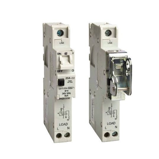 Combination RCD Circuit Breaker RCBO, 110-240 Volt, 10 Amp, 50 Hz, 6 kA Interrupt Capacity, 30 mA Trip Sensitivity, 1 + N Pole, 1 Module 17.5 mm, DIN Rail/Surface Mounting, 40 to 85 deg C, 1129 mm Height, 73 mm Width
