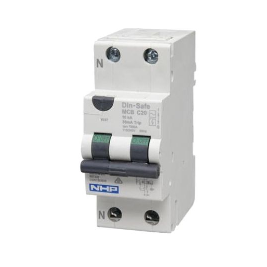 Residual Current Device, 240 Volt, 20 Amp, 50/60 Hz, 10 kA Interrupt Capacity, 10 mA Trip Sensitivity, C Curve, 1 + N Pole, 2 Module 36 mm, 1-16 sq-mm/1-25 sq-mm Flexible/1-25 sq-mm/1-35 sq-mm Rigid Terminal, Pin/Fork Connection, IP20/40, DIN Rail Mounting, 5 to 55 deg C, 86 mm Height, 36 mm Width, 68 mm Depth