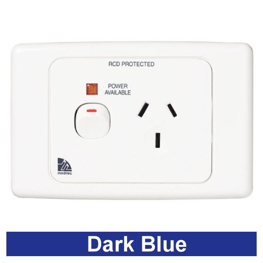 Single Switch Socket Outlet, 250 Volt Switch, 10 Amp, 50 Hz, 3, 1 Gang, Horizontal Orientation, On/Off Button Control, Rocker Switch Actuator, Flush Mounting, Screw Connection, Plastic, Dark Blue, 116 mm Height, 76 mm Width, Power Neon RCD Label